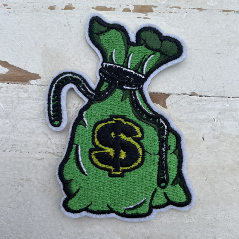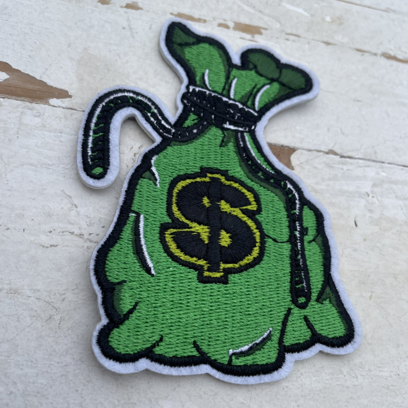 Strijkapplicatie zak geld groen 9cm.