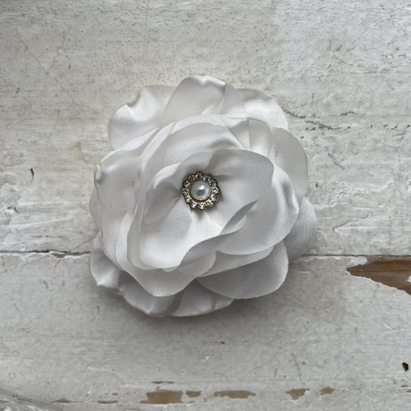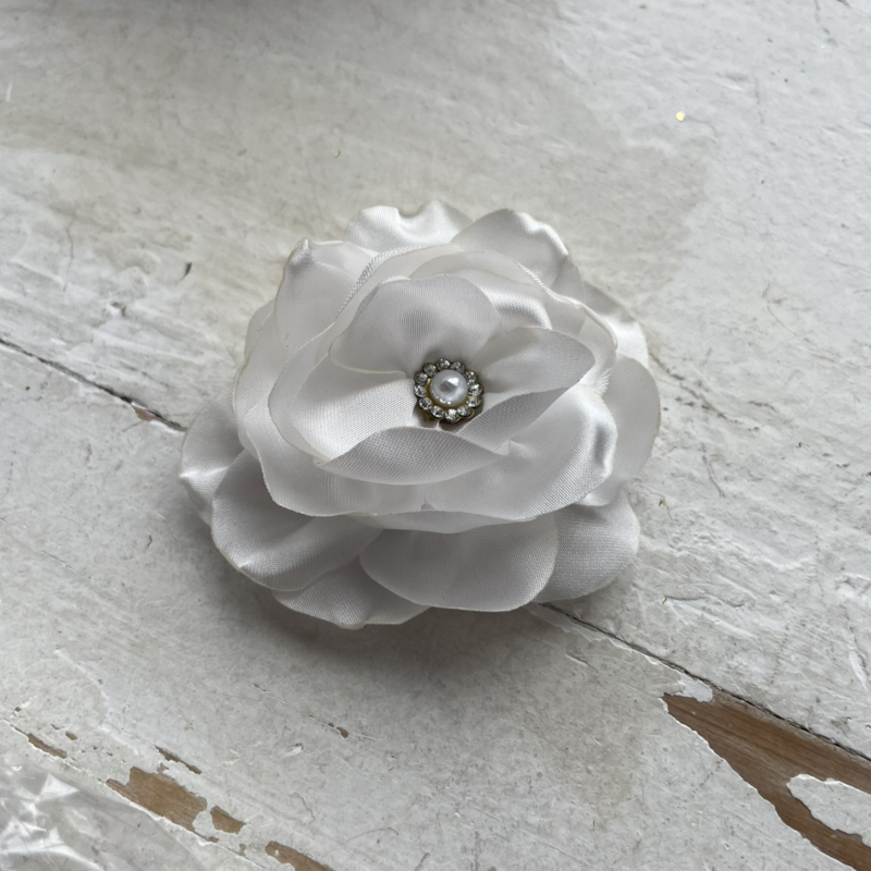OverzichtLeuke stoffen bloem met een vilten schijfje aan de onderzijde voor het bevestigen aan bijvoorbeeld een brochespeld, diadeem...